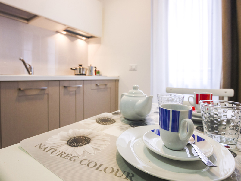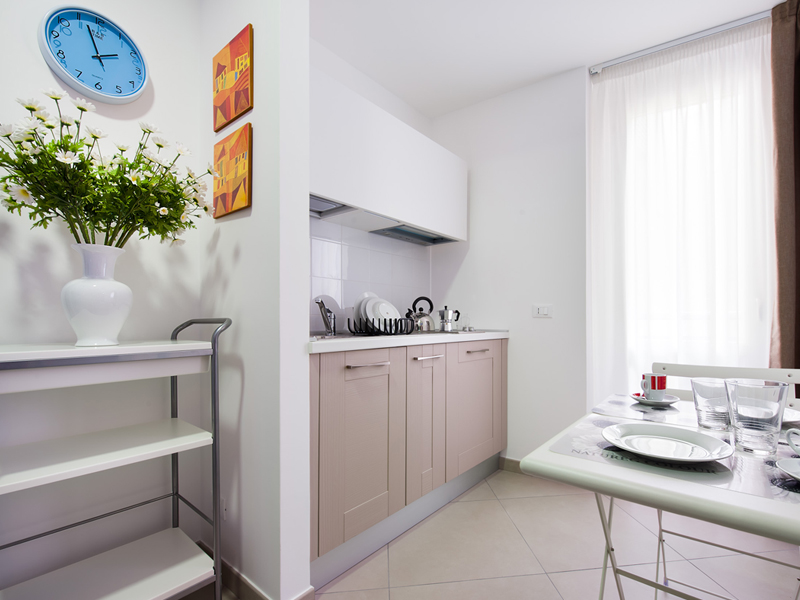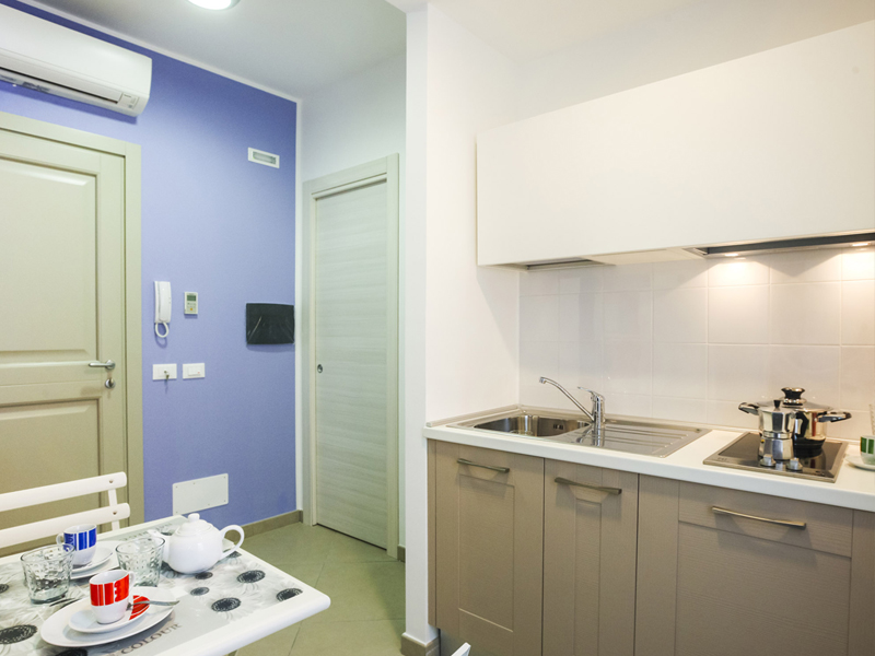 A single spacious room composed of: sleeping area with a double bed or twin beds, fully equipped kitchenette, bathroom with shower, balcony.
